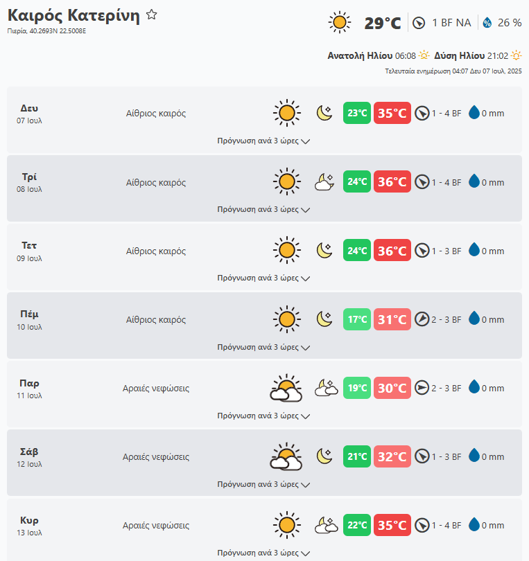 Δευτέρα 7 Ιουλίου o καιρός στην Πιερία. Δείτε τι καιρό θα κάνει το επόμενη εβδομάδα