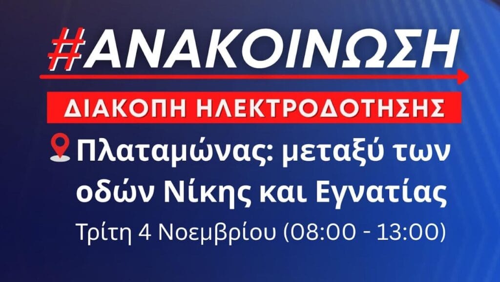 Σύμφωνα με ενημέρωση από τον ΔΕΔΔΗΕ την Τρίτη 4 Νοεμβρίου 2025 και ώρες 08:00-13:00 θα πραγματοποιηθεί προγραμματισμένη διακοπή ηλεκτροδότησης στη δημοτική κοινότητα Πλαταμώνα, στην περιοχή μεταξύ των οδών Νίκης και Εγνατίας.