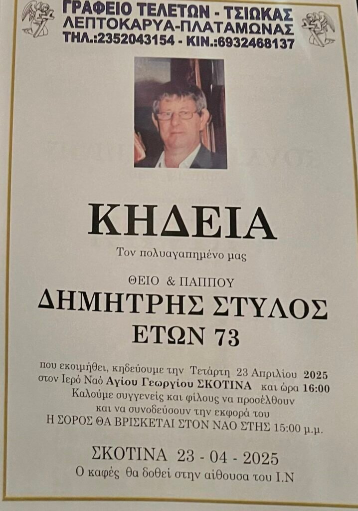 Με θλίψη ανακοινώνουμε τον θάνατο του Δημήτρη Στύλου, κατοίκου Σκοτίνας, σε ηλικία 73 ετών. Η κηδεία θα τελεστεί την Τετάρτη 23 Απριλίου, στις 4:00 μ.μ., στον Ιερό Ναό Αγίου Γεωργίου Σκοτίνας. Η σορός θα βρίσκεται στον Ναό στις 15:00 μ.μ.