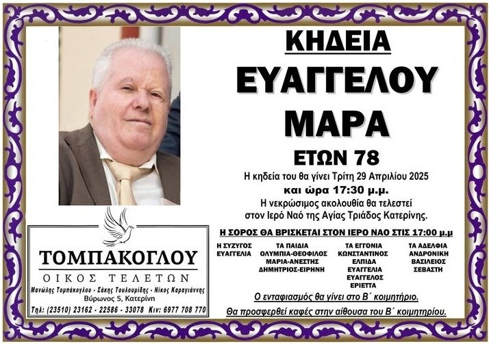 Με θλίψη πληροφορηθήκαμε την απώλεια του Ευάγγελου Μάρα , ο οποίος «έφυγε» από τη ζωή σε ηλικία 78 ετών. Η ξαφνική αυτή απώλεια βύθισε την οικογένεια και τους φίλους του σε βαθύ πένθος.