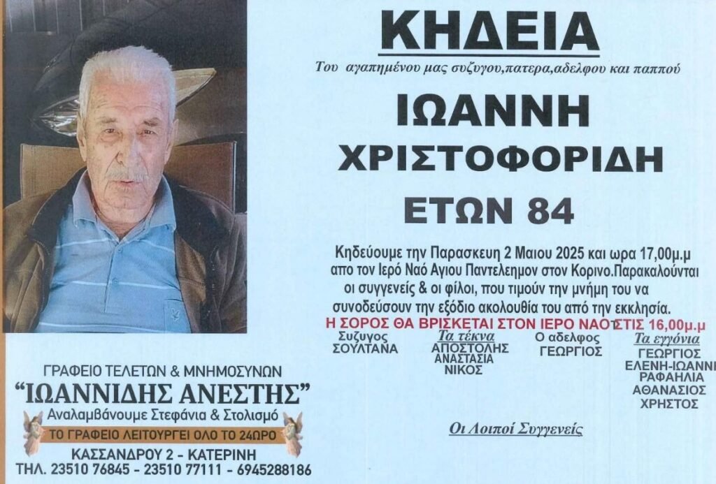 Με θλίψη πληροφορηθήκαμε την απώλεια του Ιωάννη Χριστοφορίδη, ο οποίος «έφυγε» από τη ζωή σε ηλικία 84 ετών. Η ξαφνική αυτή απώλεια βύθισε την οικογένεια και τους φίλους του σε βαθύ πένθος.