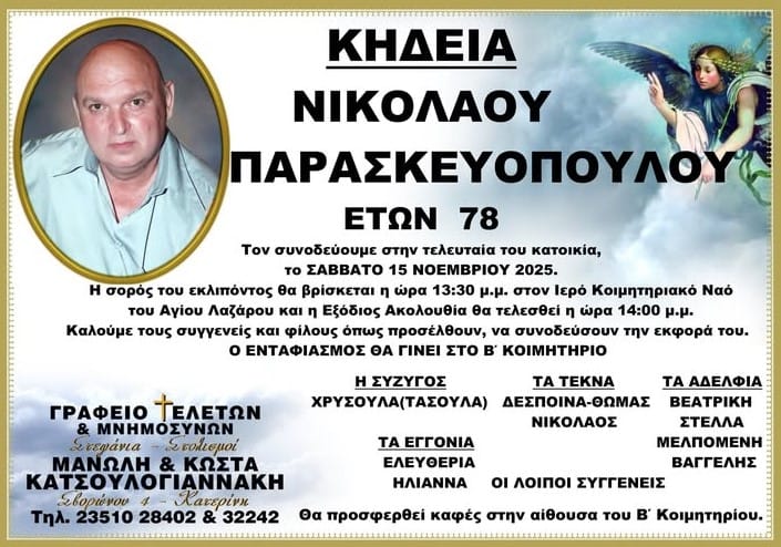 Η εξόδιος ακολουθία θα τελεστεί το Σάββατο 15 Νοεμβρίου 2025, στις 14:00, από τον Ιερό Κοιμητηριακό Ναό του Αγίου Λαζάρου.