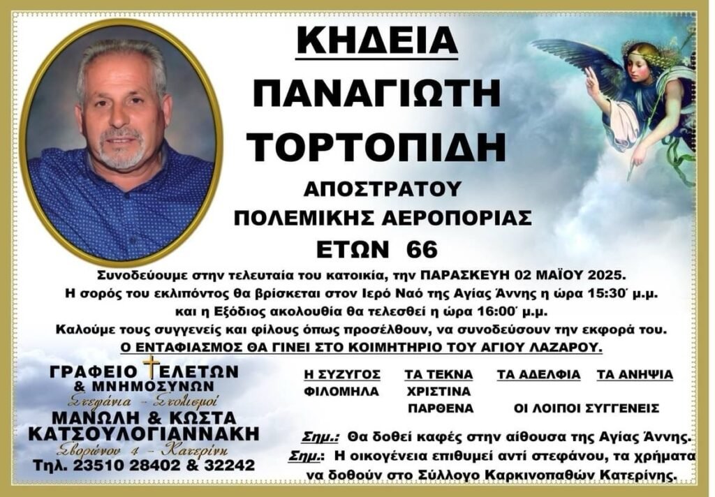 Η κηδεία του θα τελεστεί αύριο, Παρασκευή 2 Μαΐου και ώρα 15:30 μ.μ., στον Ιερό Ναό Αγίας Άννης Κατερίνης.