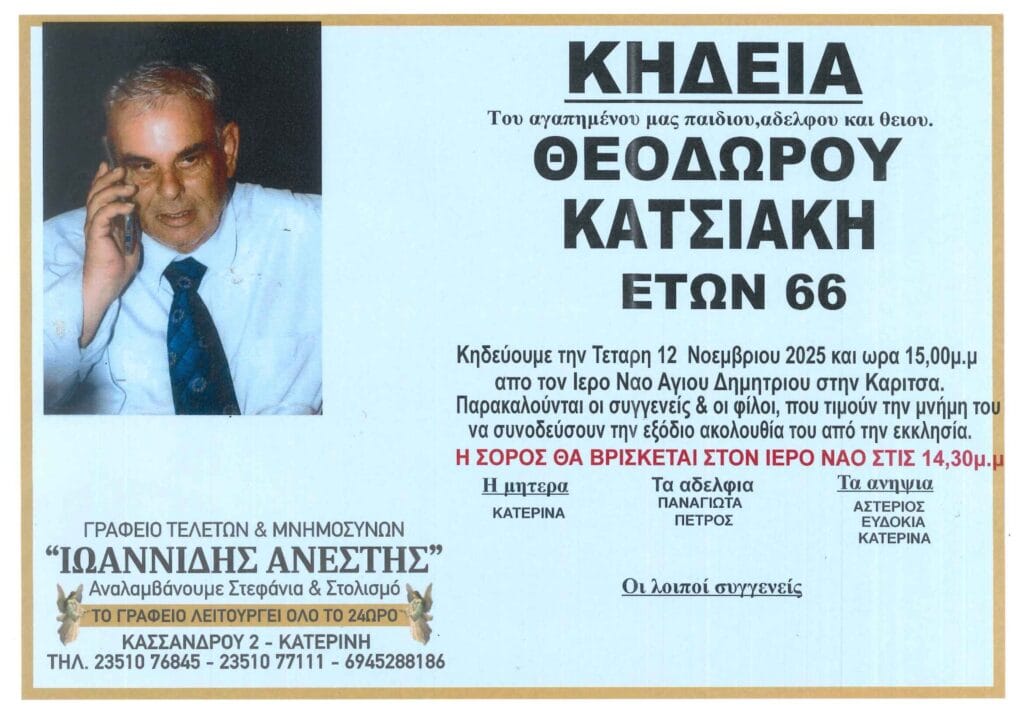 Με βαθιά θλίψη ανακοινώνουμε ότι έφυγε από τη ζωή ο Θεοδώρος Κατσιάκης, σε ηλικία 66 ετών , σκορπίζοντας τη λύπη σε συγγενείς και φίλους.