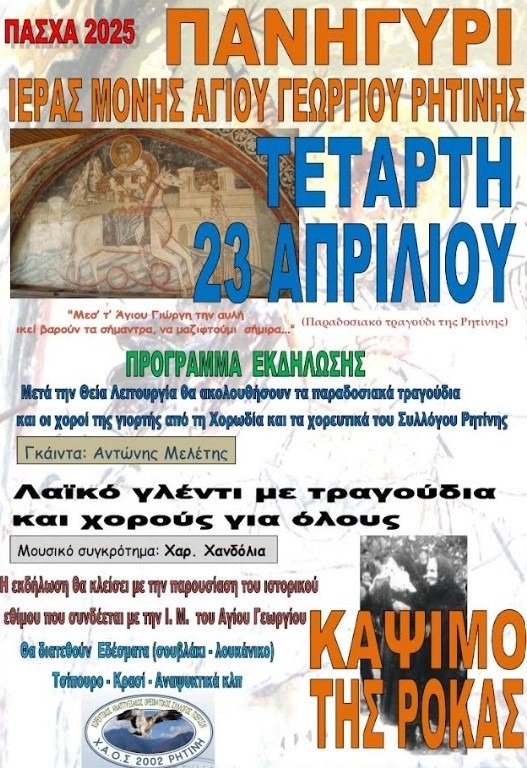 Αύριο Τετάρτη 23 Απριλίου 2025, η Ιερά Μονή θα υποδεχτεί πιστούς και επισκέπτες και οι Ρητινιώτες θα τιμήσουν τον προστάτη τους Άγιο με τα καθιερωμένα έθιμά τους