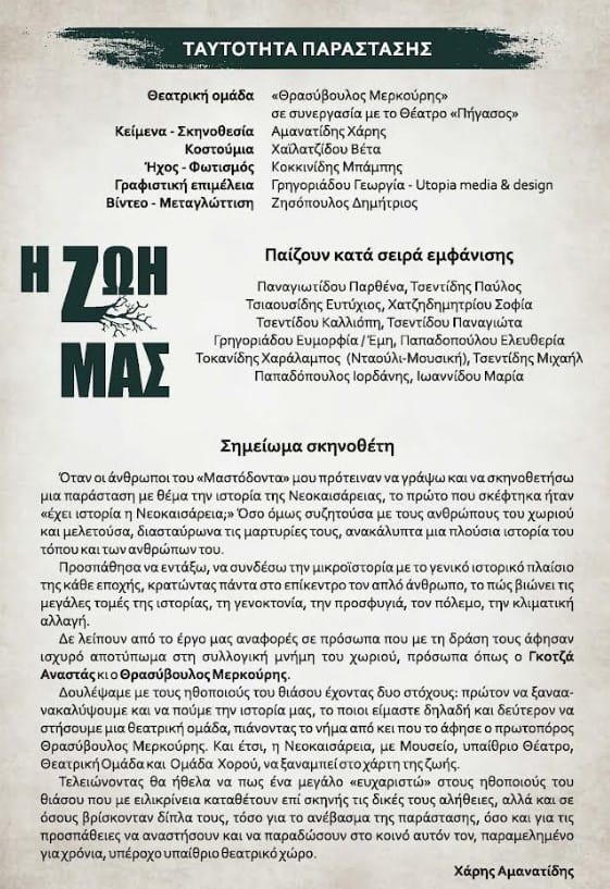 Η παράσταση «Η ΖΩΗ ΜΑΣ» είναι ένα βαθιά συγκινητικό έργο που συνδυάζει στοιχεία κοινωνικού ρεαλισμού, δράματος και σύγχρονης κωμωδίας. Διαδραματίζεται σε ένα μικρό χωριό της Πιερίας, αντλώντας έμπνευση από τις πραγματικές ρίζες της Νεοκαισάρειας.