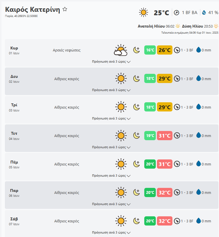 Πρόγνωση καιρού για επόμενη εβδομάδα Κυριακή 01 έως και Σάββατο 07 – 06 – 2025.