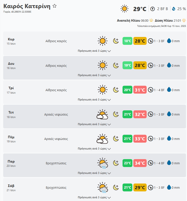 Κυριακή 15 Ιουνίου o καιρός στην Πιερία. Δείτε τι καιρό θα κάνει το επόμενη εβδομάδα