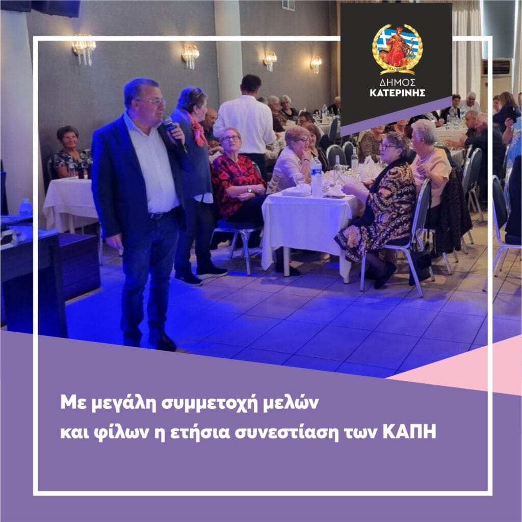 Σε εορταστικό κλίμα πραγματοποιήθηκε την Κυριακή 26 Οκτωβρίου, σε γνωστή αίθουσα εκδηλώσεων, η καθιερωμένη ετήσια συνεστίαση των μελών των ΚΑΠΗ του Δήμου Κατερίνης, με αφορμή την Παγκόσμια Ημέρα Τρίτης Ηλικίας.