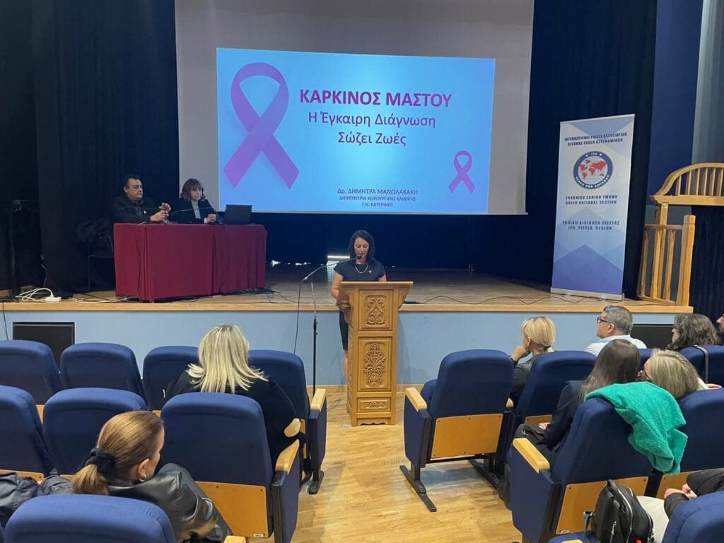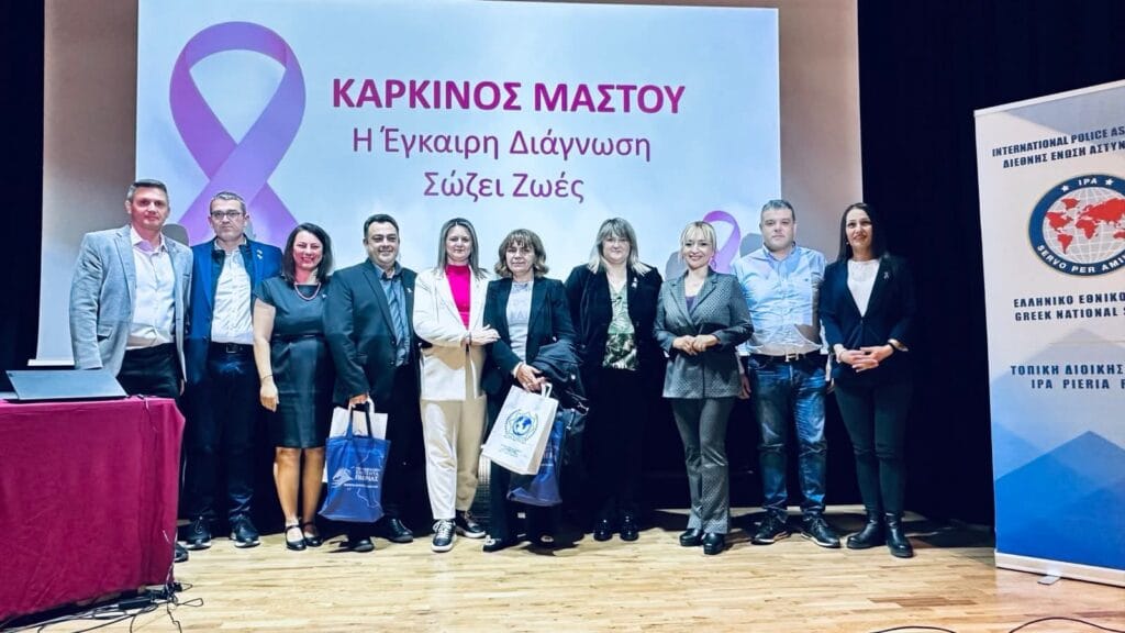 Με μεγάλη επιτυχία πραγματοποιήθηκε η ενημερωτική ημερίδα για την πρόληψη κατά του καρκίνου του μαστού  με τίτλο «Μη Φοβάσαι, Ενημερώσου, Ρώτα», την Τετάρτη 29 Οκτωβρίου 2025, στο Πνευματικό Κέντρο Αγ. Φωτίου Κατερίνης, η οποία διοργανώθηκε από την Τοπική Διοίκηση Πιερίας της Διεθνούς Ένωσης Αστυνομικών (I.P.A.) σε συνεργασία με την Περιφερειακή Ενότητα Πιερίας και τον Σύλλογο Καρκινοπαθών Πιερίας  υπό την Αιγίδα της Ιεράς Μητροπόλεως Κίτρους, Κατερίνης και Πλαταμώνος και του Ιατρικού Συλλόγου Πιερίας.