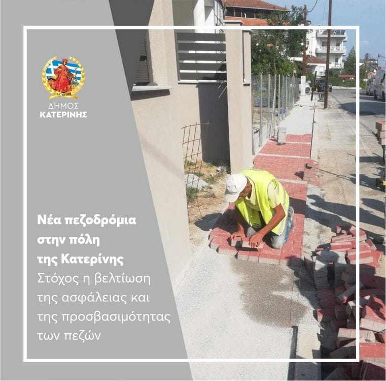 Στην αναβάθμιση και ασφαλή χρήση του δημόσιου χώρου συμβάλλει η κατασκευή και επίστρωση νέων πεζοδρομίων με πιστοποιημένους κυβόλιθους από ψυχρά υλικά, σε οδούς της Κατερίνης. «Δίνουμε πνοή στην πόλη και εξασφαλίζουμε τις καλύτερες δυνατές υποδομές. Μέριμνά μας είναι η βελτίωση της ασφάλειας και της προσβασιμότητας των πεζών» τόνισε αναφερόμενος στις παρεμβάσεις, ο Δήμαρχος Κατερίνης, Ιωάννης Ντούμος.