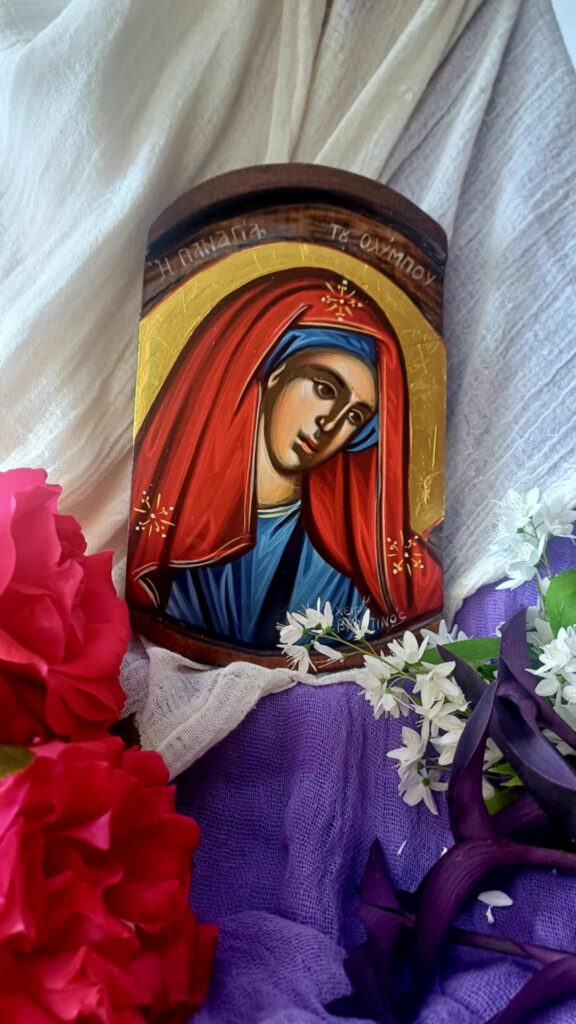Η «Παναγιά του Ολύμπου» αποτελεί σημείο αναφοράς στην καλλιτεχνική και πνευματική του διαδρομή. Με βαθύ σεβασμό προς την Υπεραγία Θεοτόκο και την ιερότητα του Ολύμπου, ο Γιώργος Βροντινός εμπνέεται και αποδίδει με ιεροπρέπεια την Παναγία ως Μάνα, Προστάτιδα και Οδηγήτρια, ενσωματώνοντας στο έργο του την καλλιτεχνική παράδοση και τη δύναμη της πίστης.