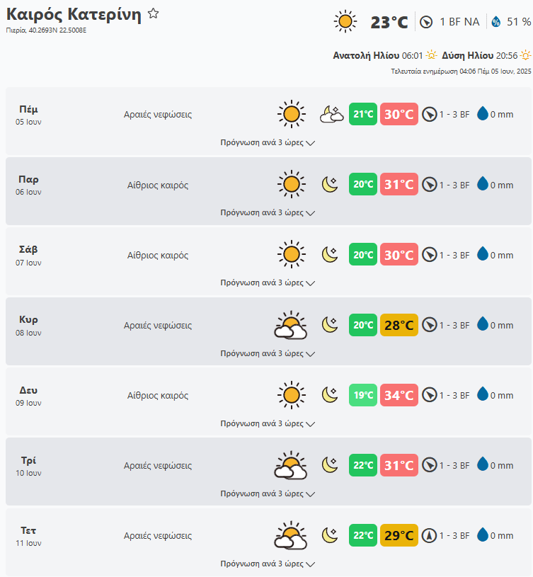Ο καιρός στην Πιερία Πρόγνωση καιρού για την επόμενη εβδομάδα: Πέμπτη 25 έως και Τετάρτη 31 – 12– 2025.