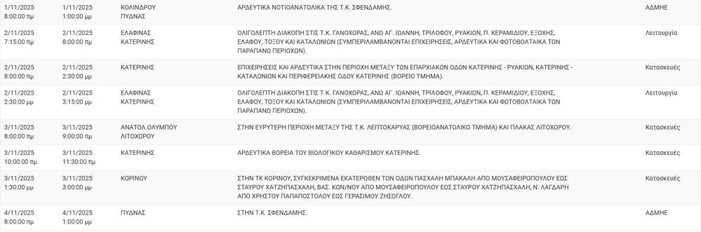 Σύμφωνα με ενημέρωση από τον ΔΕΔΔΗΕ, στις 1/11, 2/11, 3/11, 4/11 Νοεμβρίου θα πραγματοποιηθούν προγραμματισμένες διακοπές ηλεκτροδότησης σε περιοχές του νομού Πιερίας