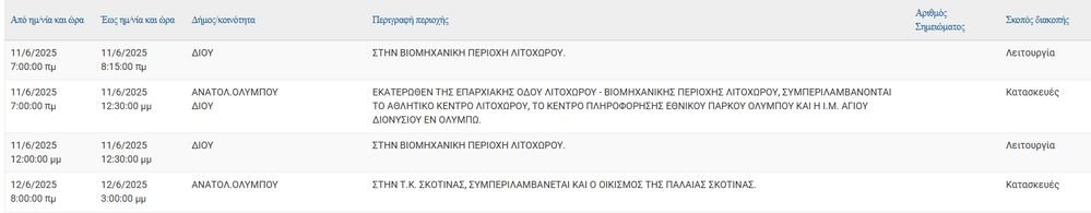 Σύμφωνα με ανακοίνωση του ΔΕΔΔΗΕ έχει προγραμματιστεί η παρακάτω διακοπή ρεύματος στις 11/06, 12/06.