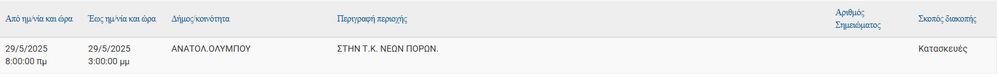 Σύμφωνα με ανακοίνωση του ΔΕΔΔΗΕ έχει προγραμματιστεί η παρακάτω διακοπή ρεύματος σήμερα 29/5.