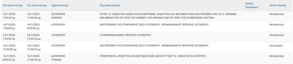 Σύμφωνα με ανακοίνωση του ΔΕΔΔΗΕ έχει προγραμματιστεί η παρακάτω διακοπή ρεύματος στις 13/07, 14/07, 16/07.