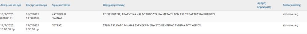 Σύμφωνα με ανακοίνωση του ΔΕΔΔΗΕ έχει προγραμματιστεί η παρακάτω διακοπή ρεύματος στις 16/07,17/07.