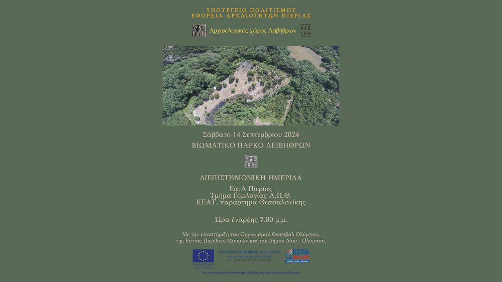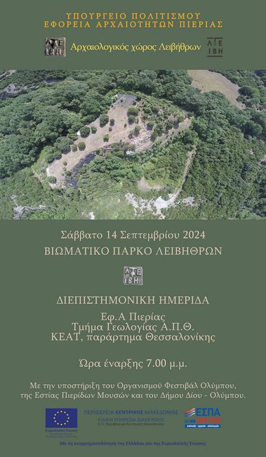 Η Εφορεία Αρχαιοτήτων Πιερίας σας προσκαλεί το Σάββατο 14 Σεπτεμβρίου 2024 και ώρα 7.00 μ.μ., στη διεπιστημονική ημερίδα που συνδιοργανώνει με το τμήμα Γεωλογίας του Αριστοτελείου Πανεπιστημίου Θεσσαλονίκης, αναφορικά με τον αρχαιολογικό χώρο των Λειβήθρων στο Βιωματικό Πάρκο Λειβήθρων (ευρύτερη περιοχή Παλαιάς Λεπτοκαρυάς) [τοποθεσία].