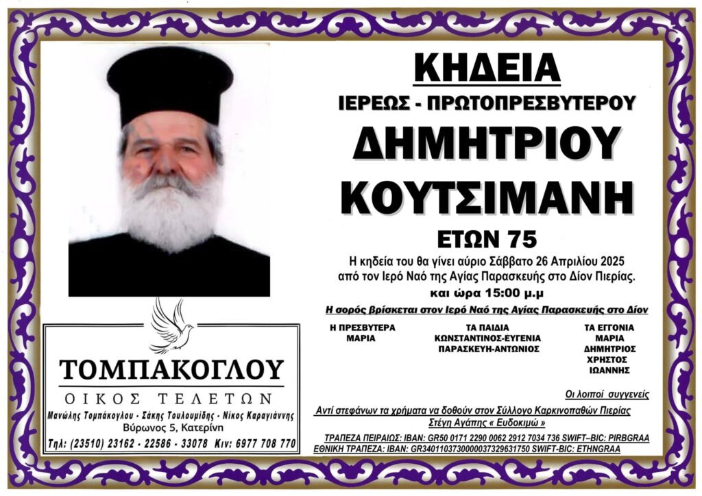 Με μεγάλη θλίψη πληροφορηθήκαμε την απώλεια του Δημητρίου Κουτσιμάνη, ο οποίος εκοιμήθη σε ηλικία 75 ετών. Το Δίον αποχαιρετά με σεβασμό και συγκίνηση τον παπά Δημήτρη, ο οποίος υπηρέτησε με αφοσίωση και πίστη την εκκλησία και την τοπική κοινωνία για πολλά χρόνια. Η απώλεια του αφήνει κενό στις καρδιές όλων όσων τον γνώρισαν.