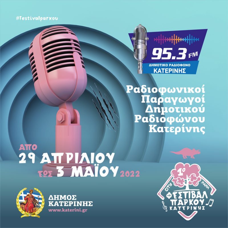 Παραγωγοί του Δημοτικού Ραδιοφώνου Κατερίνης «ντύνουν» μουσικά το Φεστιβάλ Πάρκου Πότε: 29 Απριλίου – 3 Μαΐου Ωράριο: 12:00 – 14:00, 17:00 – 19:00, 19:00 –