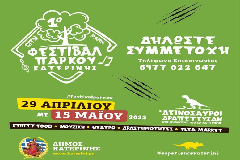 Δήμος Κατερίνης – 1ο ΦΕΣΤΙΒΑΛ ΠΑΡΚΟΥ «Οι Δεινόσαυροι δραπέτευσαν» Στο πάρκο της Κατερίνης 29 Απριλίου – 15 Μαΐου