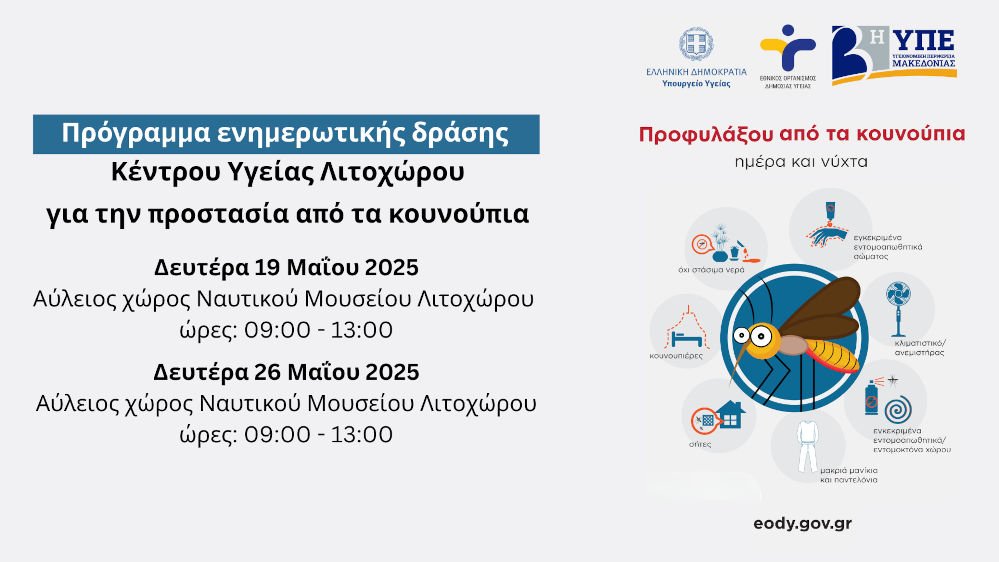 Στο πλαίσιο της ενημέρωσης των πολιτών για τις μεθόδους προστασίαςκαι προφύλαξης από τα κουνούπια, το Κέντρο Υγείας Λιτοχώρουδιοργανώνει πρόγραμμα ενημερωτικής δράσης.Δευτέρα 19 Μαΐου 2025 Αύλειος