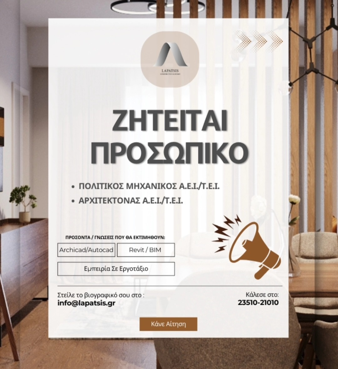 Η εταιρεία Lapatsis αναζητά νέα στελέχη για την ενίσχυση της ομάδας της. Διαθέσιμες Θέσεις Πολιτικός Μηχανικός (Α.Ε.Ι. / Τ.Ε.Ι.) Αρχιτέκτονας (Α.Ε.Ι. / Τ.Ε.Ι.) Προσόντα που