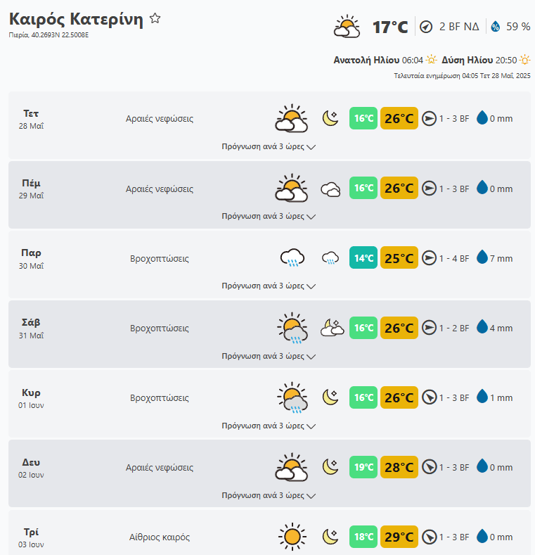 Τετάρτη 28 Μαΐου o καιρός στην Πιερία. Δείτε τι καιρό θα κάνει το επόμενη εβδομάδα