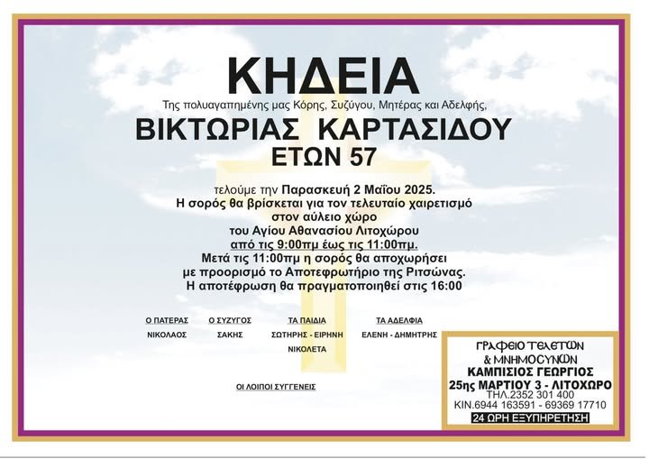 Βαθιά θλίψη προκάλεσε στην τοπική κοινωνία του Λιτοχώρου η πρόωρη απώλεια της Βικτώριας Καρτασίδου, η οποία «έφυγε» από τη ζωή σε ηλικία μόλις 57 ετών.
