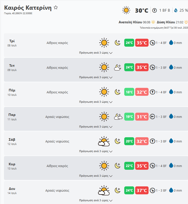 Τρίτη 8 Ιουλίου o καιρός στην Πιερία. Δείτε τι καιρό θα κάνει ο επόμενη εβδομάδα
