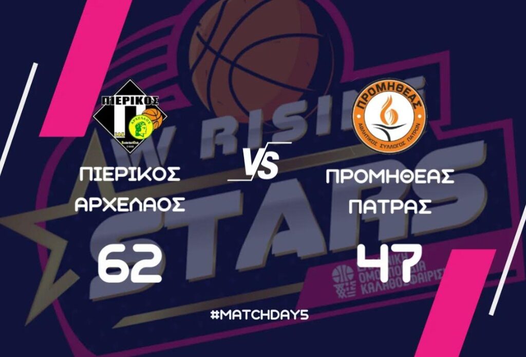 Ο Πιερικός Αρχέλαος επικράτησε με 62-47 του Προμηθέα Πάτρας, στο Κλειστό Γυμναστήριο Επταπυργίου, σε αγώνα για την 5η αγωνιστική του W Rising Stars.