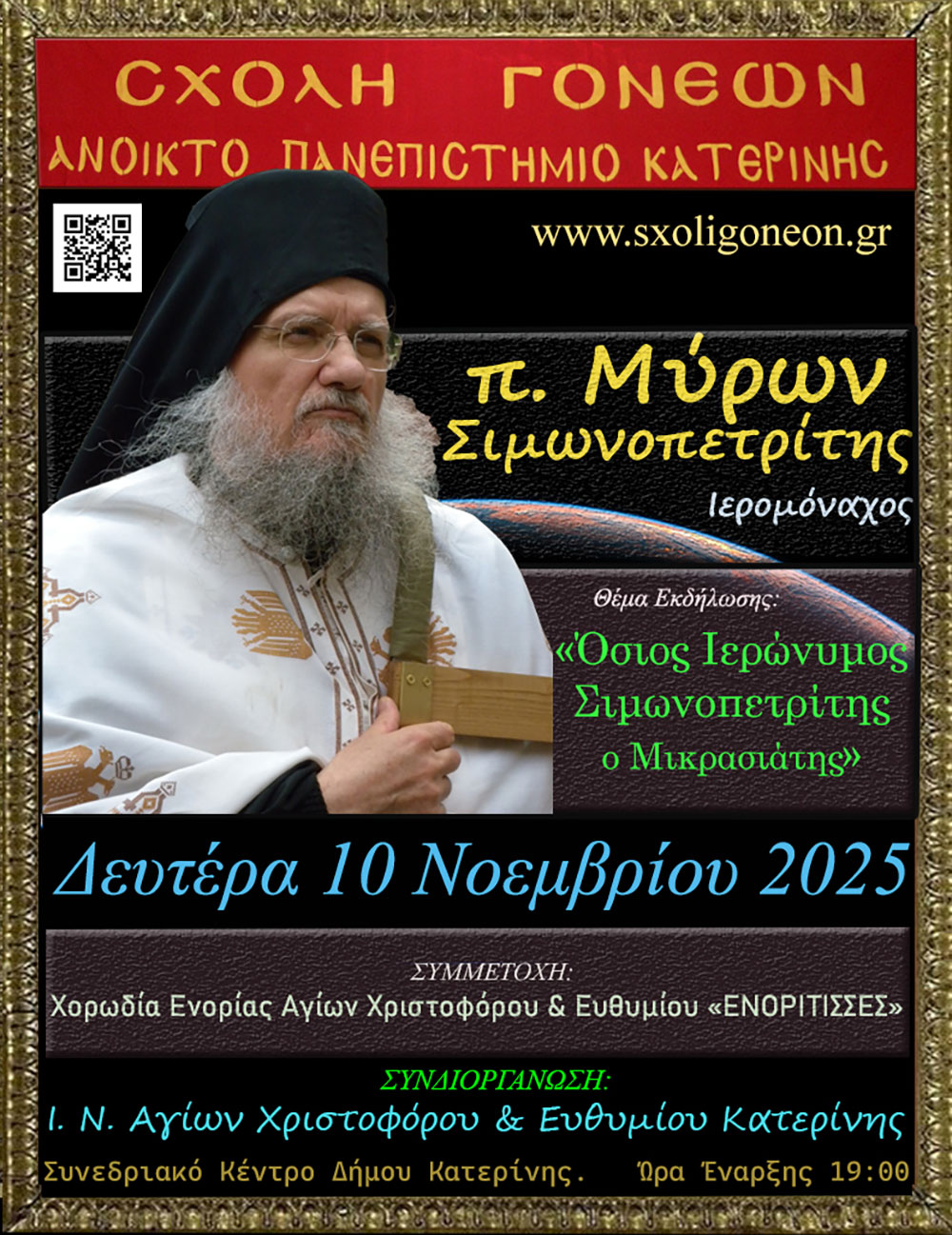 Η επόμενη εκδήλωση θα πραγματοποιηθεί την προσεχή Δευτέρα 10 Νοεμβρίου με επίσημο ομιλητή και καλεσμένο τον Ιερομόναχο π. Μύρωνα Σιμωνοπετρίτη και θέμα: «Όσιος Ιερώνυμος Σιμωνοπετρίτης ο Μικρασιάτης».